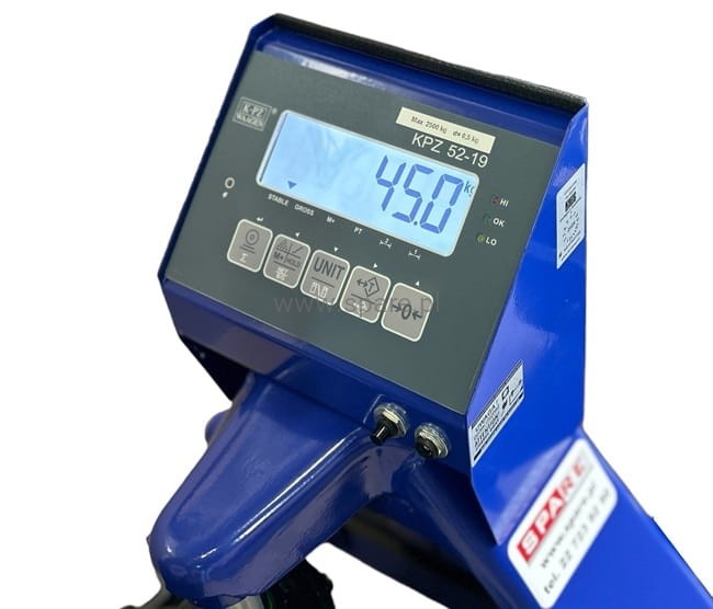 Polski ręczny wózek widłowy, paletowy z wagą. Paleciak KPZ 71-9, z panelem 52-19